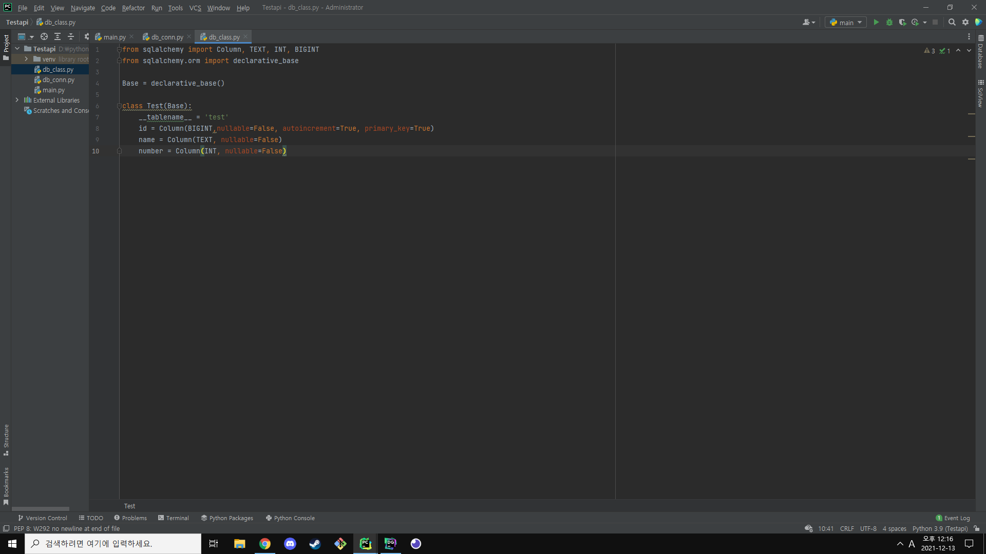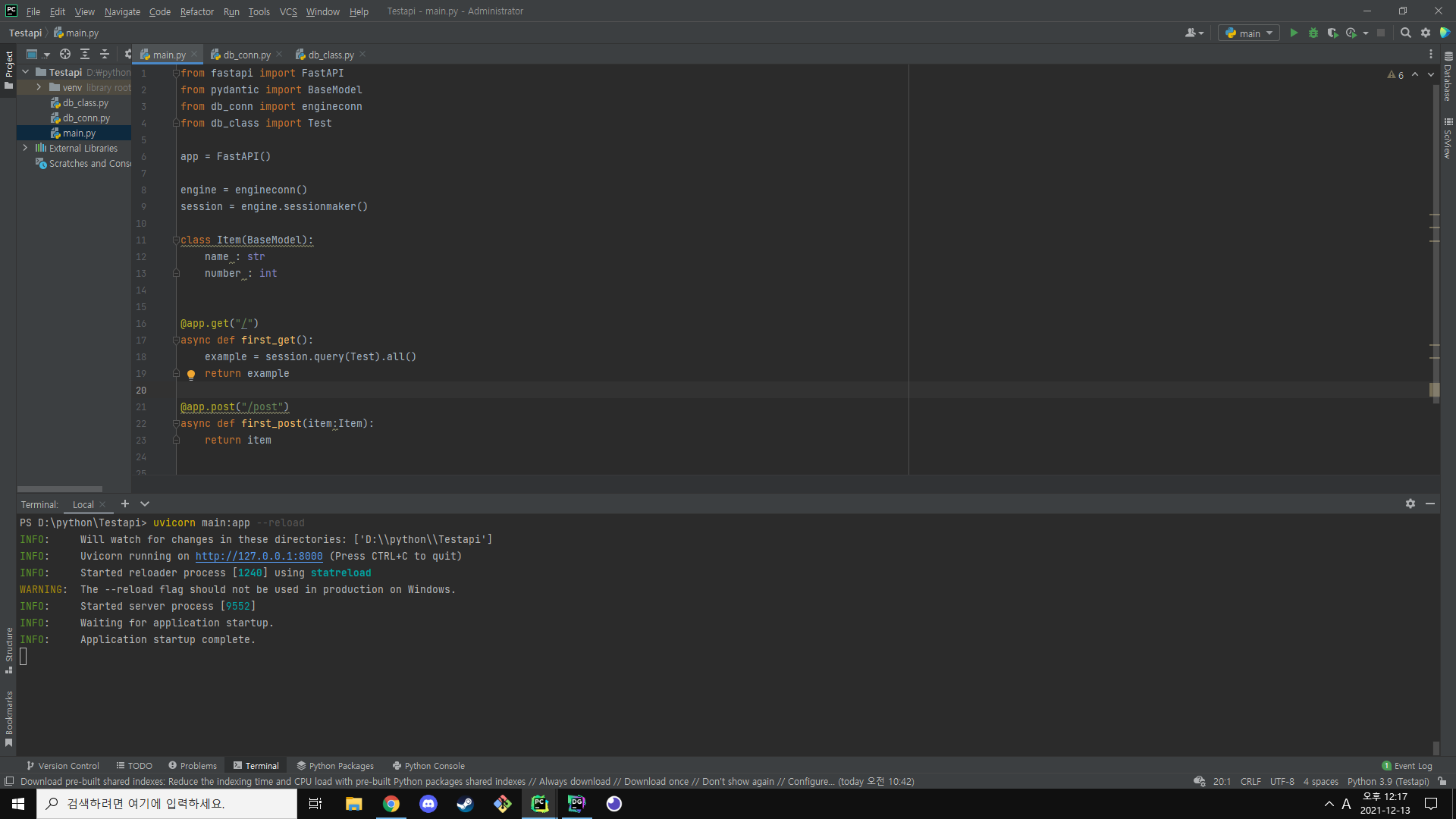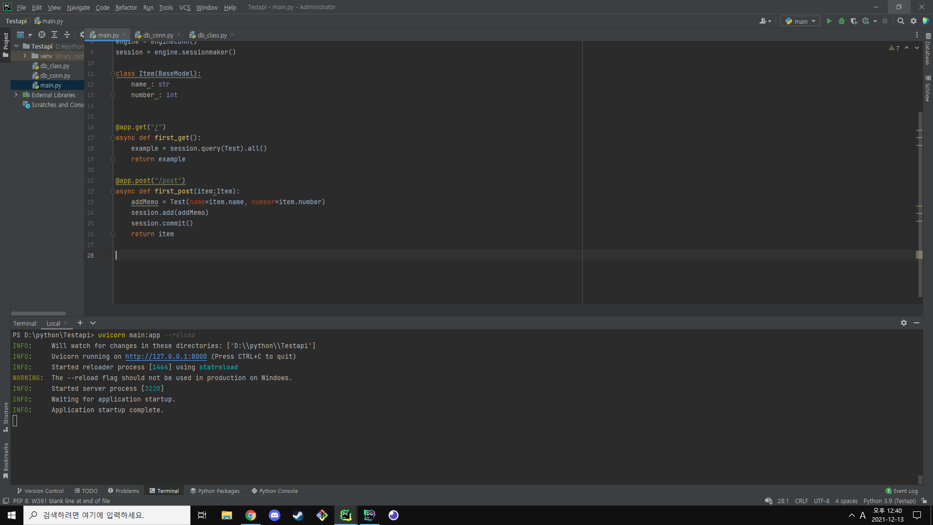 테이블까지 매핑을 시켰다면 이제 우리는 main.py로 다시 되돌아가서 API가 실행 될때마다 데이터베이스에 접속해 데이터를 조회하는 것을 한 번 해볼겁니다.