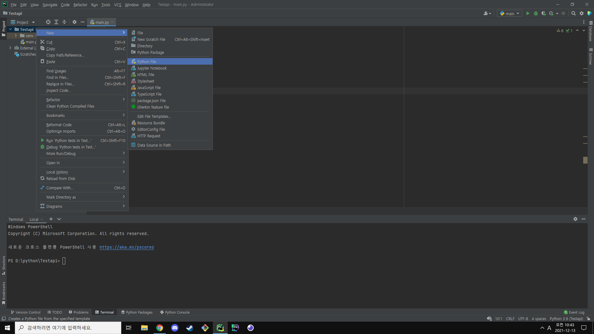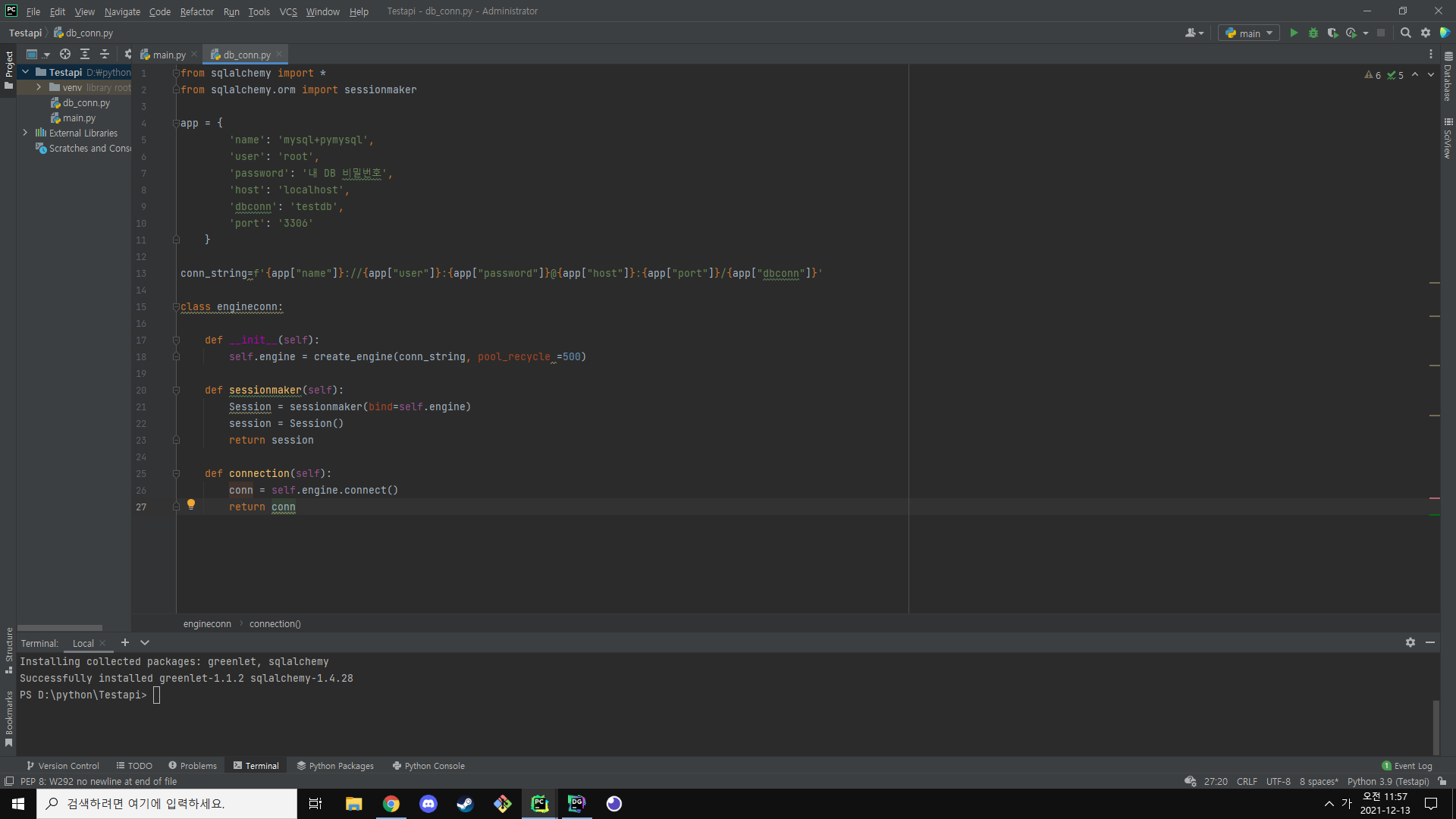 프로젝트 폴더를 클릭해 New -> Python file -> db_conn 으로 파이썬 파일을 생성 시켜 줍니다.